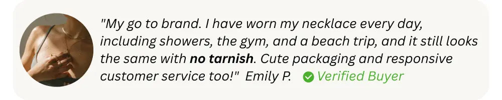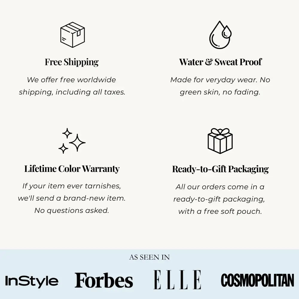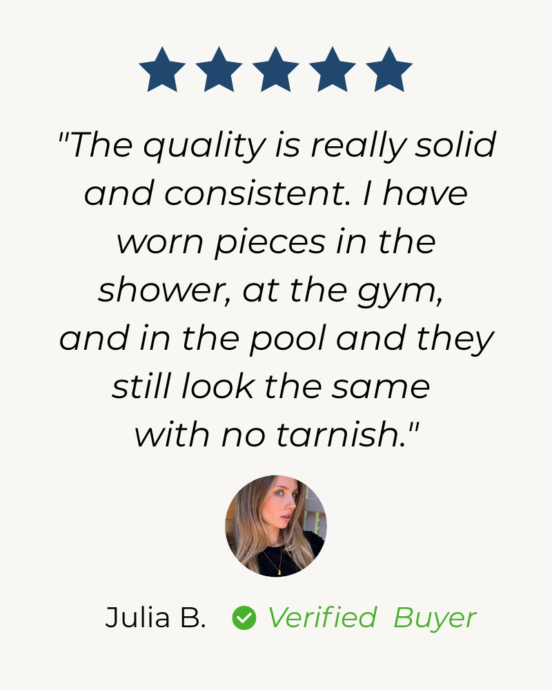 Our jewellery is 100% waterproof, so you never have to take it off! Wear it in the shower, at the gym, in the pool, or even at the beach – it won’t tarnish. ✨